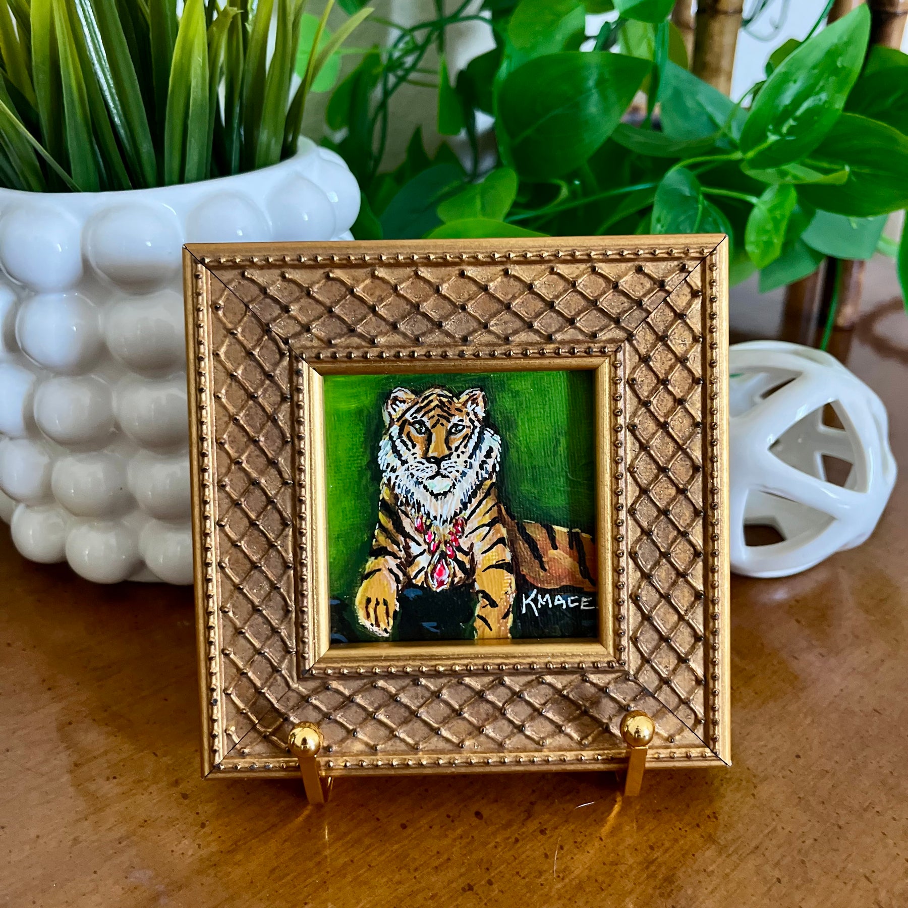 5" x 5" premium wood with gold gilt frame. Gold display stand included. Also equipped with hanging hardware if you decide to hang your mini on a wall.